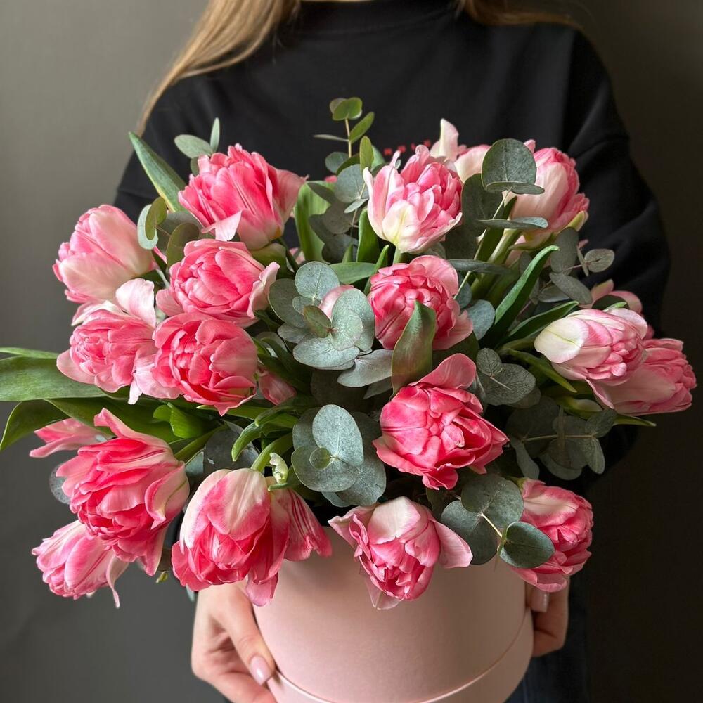 охапка пионовидных тюльпанов в шляпной коробке – отличный презент для ваших любимых